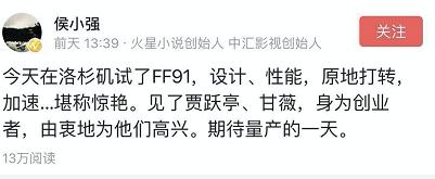 另一方面,盛大文学原CEO、火星小说创始人侯小强23日在微头条上称,他在洛杉矶试了FF91,感觉设计、性能、原地打转、加速等等都堪称惊艳。但该内容己被删除。