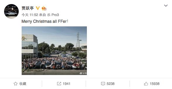 25日早间,贾跃亭在微博上现身庆祝圣诞节,晒出了包含7辆FF91在内的法拉第未来所有员工及设备厂房的照片,配文:Merry Christmas all FFer!当日还有媒体报道称FF10亿美元融资到位。
