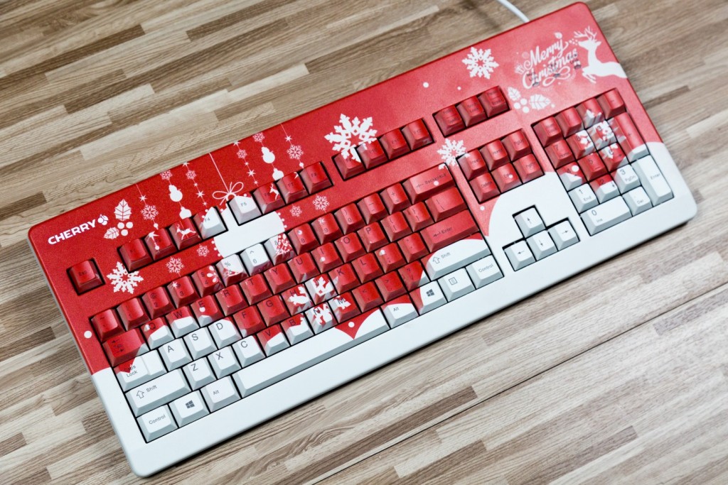 在 Cherry 官方微博中给出的图案中,他们就晒出了好几款定制版的键盘,比如下面这个特别有节日气氛的圣诞版: