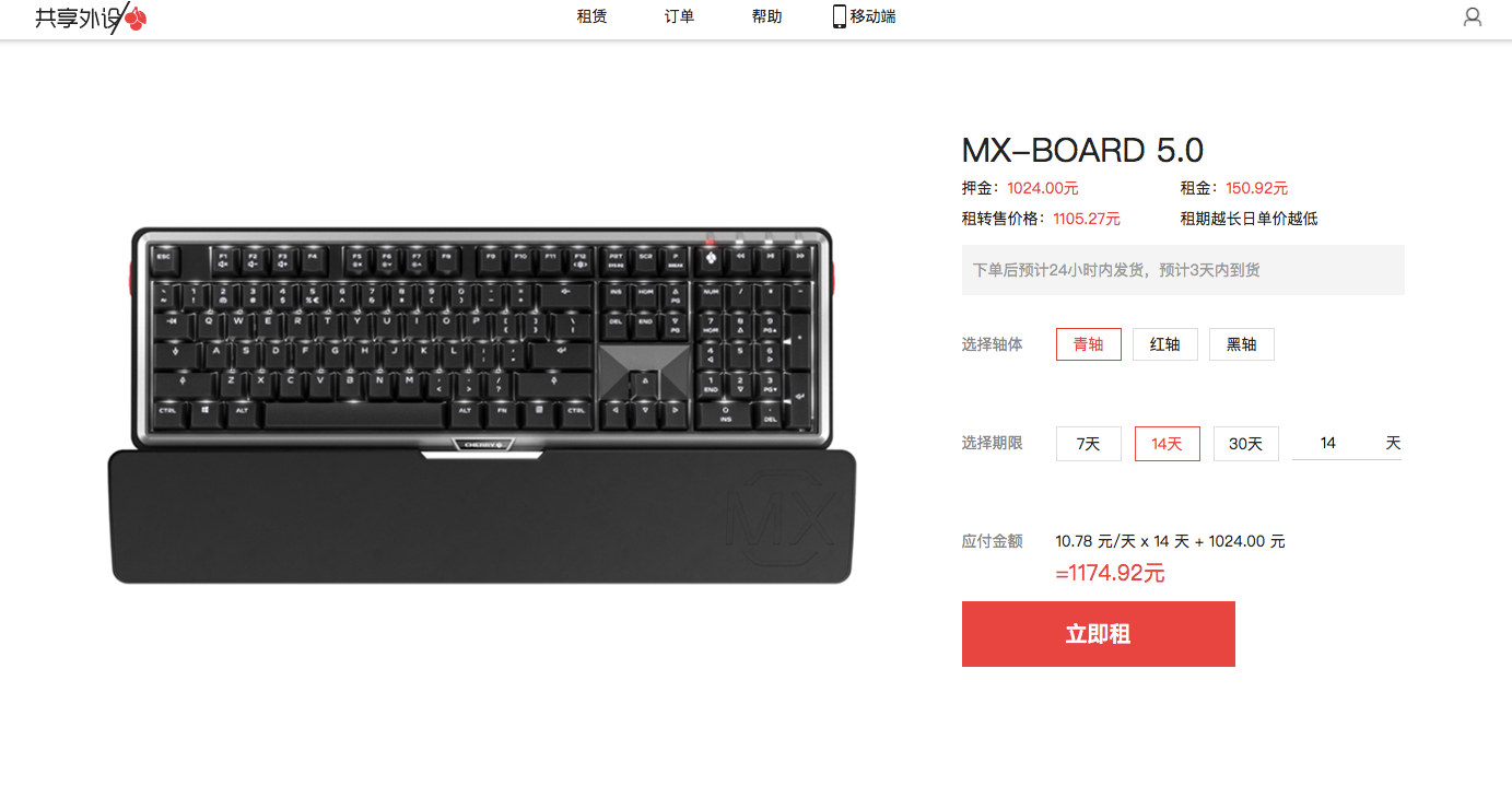 以 Cherry 的 MX-BOARD 5.0 为例,青轴款的官方售价为 1229 元;而如果选择租的话,除了 1024 元的押金之外,一个月的租金仅为 278.7 元,到期后验货无误即退还。