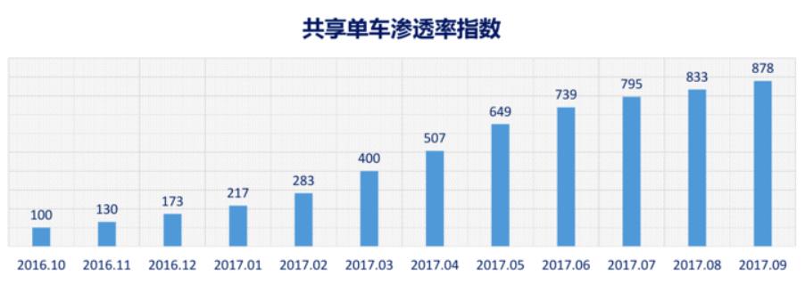 首份《共享单车行业发展指数报告》显示,自去年10月以来,共享单车在我国呈现出爆发式的增长。共享单车渗透率指数(渗透率指数反映共享单车在我国的普及程度)一年增长近8倍,2017年3月到6月涨势尤其突出,7月以后渗透率指数增速放缓。