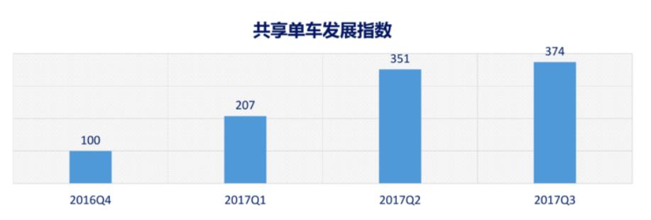 报告还显示,2017年前三季度我国共享单车发展指数分别达到207、351、374,其中分值越高发展景气越佳。第三季度共享单车行业发展指数达到374,环比增长7%,而前两季度环比增长分别是107%和70%,说明行业整体结束爆发式增长,步入平稳增长期。