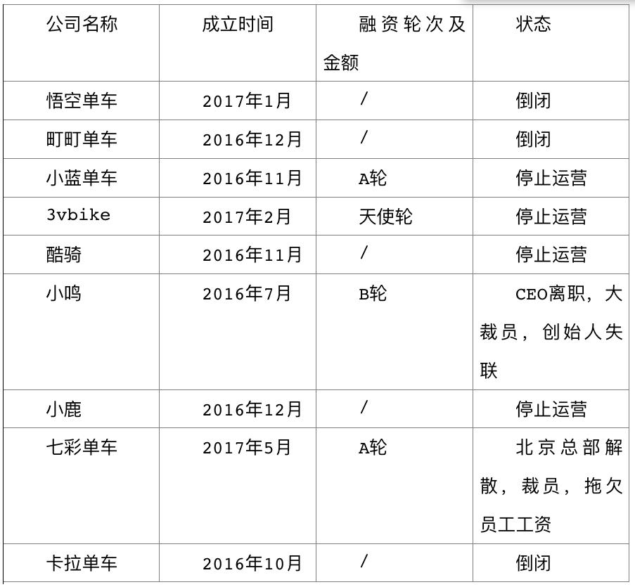 而另一边,是部分单车企业的黯然离场。当市场沉淀资本冷静,第二第三梯队玩家难以对摩拜、ofo等排名靠前的企业造成威胁,很难再通过融资吸引投资人注资,再加上丢失损毁严重造成运营和投放成本过高、技术创新不足、盈利模式又不明确,所以当这些创业公司烧完钱后,又很难得到融资,黯然离场成了早已注定的结局。