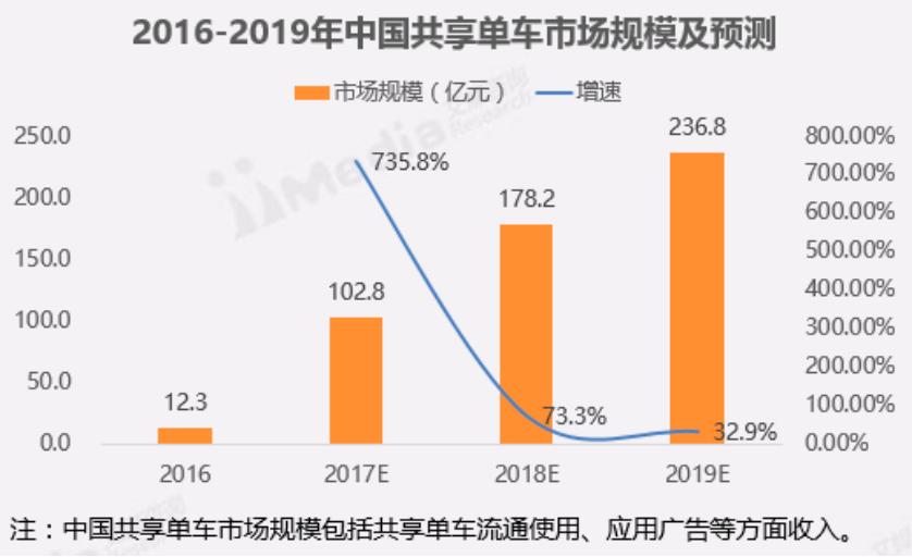 艾媒咨询数据显示,今年共享单车用户规模为2.09亿人,市场规模为102.8亿元。预计到2018年,用户规模将达到2.98亿人,市场规模为178.2亿元。到了2019年,用户规模将达到3.76亿人,市场规模为236.8亿元。