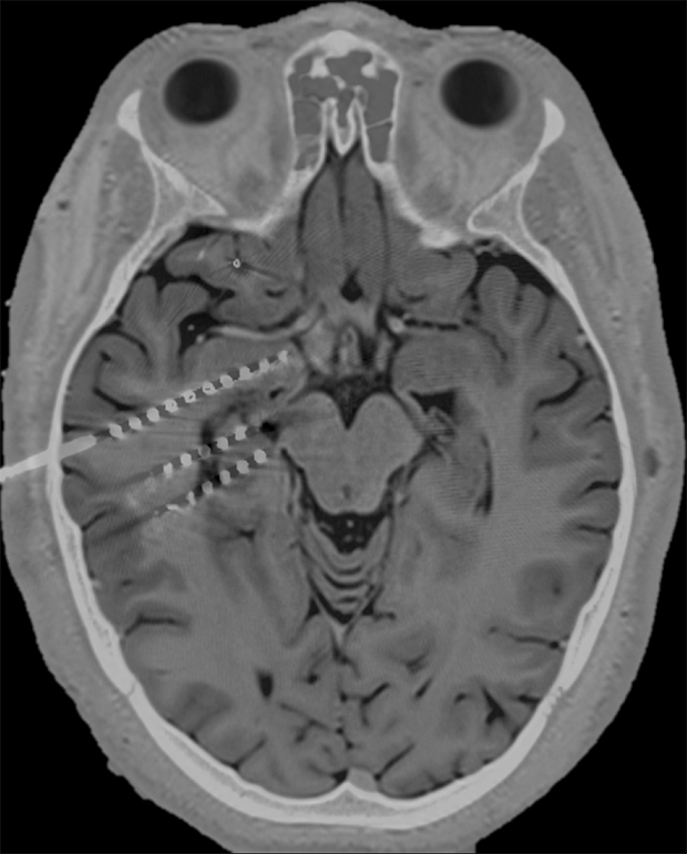 核磁共振和 CT 扫描结果显示,电极会刺激杏仁核(上)、海马体前部(中)和中部(下)