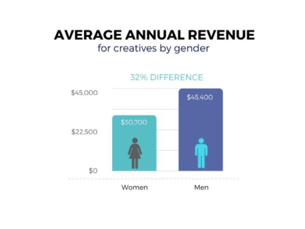 如图基于Honeybook.的统计,男性的平均年薪为45,400美金,而女性只有30700美金。其中另一个值得注意的问题是,男性在整个生产、加工的流程中可能会得到更多的供应商,但大多数人却很少关注相关的标准化的费率,导致有近63%的报告称男女之间的工薪地位几乎是平等的。