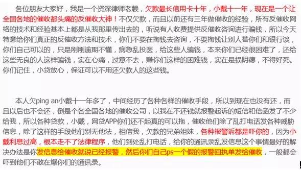 与此同时,越来越多的老赖有了“维权”意识,开始用短信截屏、电话录音、监管投诉等手段对付正规的催收公司;网上也开始出现大量的帖子教老赖如何应对催收。比如针对短信和电话催收,一些所谓的反催收大神教大家“短信截图留证,通话内容最好录音,可攒足证据去互联网金融协会投诉复”。