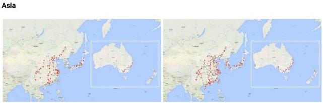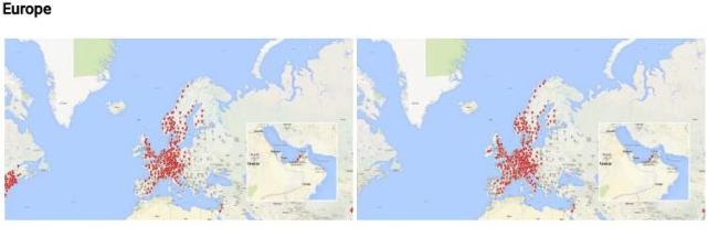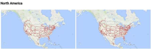 以下的地图分别是特斯拉在2017年4月(左)运营和规划的超级充电站分布图,以及12月(右)运营的超级充电站分布图。