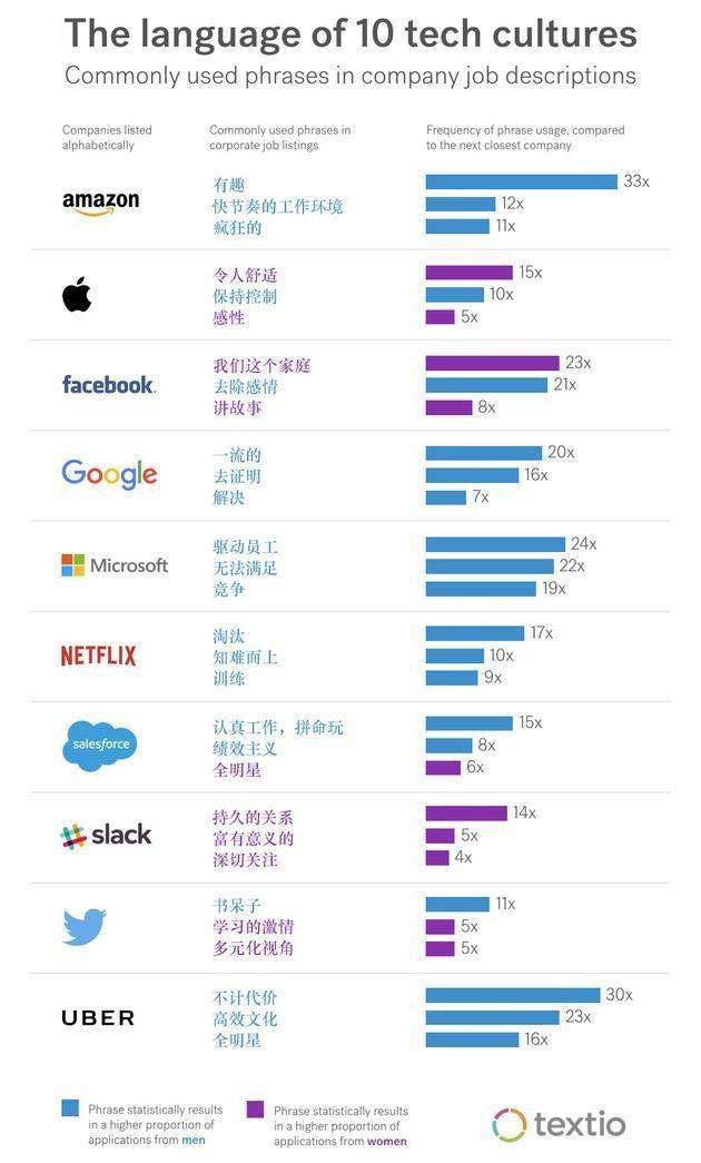 Textio 是一家专做特定情境下词汇和语言分析的创业公司,旨在帮助企业提升招聘质量和效率。近日,Textio 对谷歌、苹果、Facebook 和亚马逊等 10 家科技公司的近 2.5 万条招聘信息的用词进行了分析。