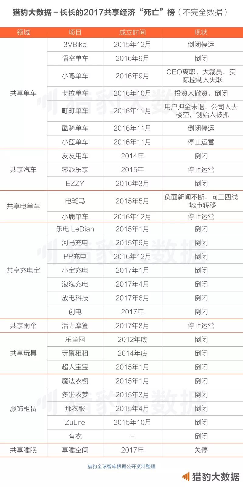 纵观2017年众多的共享项目,除了披上共享的“外衣”后热闹一时外,多数都以不同的“姿势”倒下了,有的直接宣布倒闭停止运营,有的甚至在一两天之内就因为政府的监管而宣告失败,更有携用户押金逃之夭夭者,如果能在公司倒下前被收购,或许都已经是最好的结果了。有哪些原因导致这些共享项目从风光无限到变成如此的落寞失败呢?