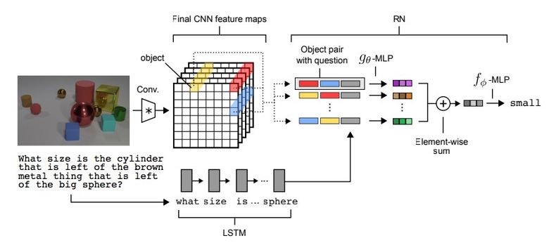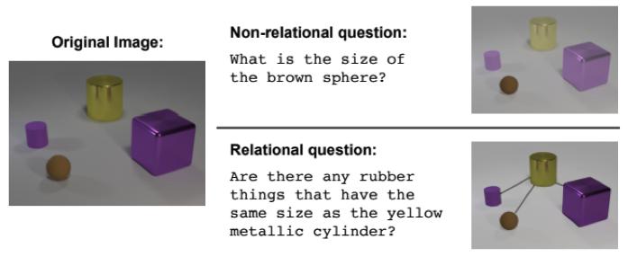 有一种任务类型叫做视觉推理,神经网络被要求根据一张照片来回答问题。比方说:“图中橡皮材料的物品跟黄色金属圆柱体的数量是不是一样的?”这个问题可不是小问题,直到最近,解决的准确率也只有68.5%。