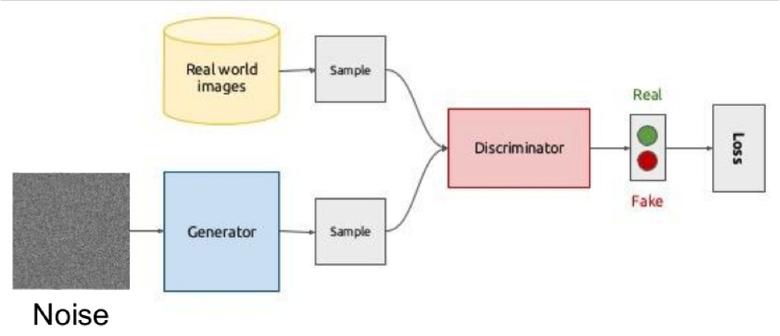 其想法体现在两个网络——生成器与鉴别器的博弈上。第一个网络创作图像,然后对二个网络试图理解该图像是真实的还是生成的。