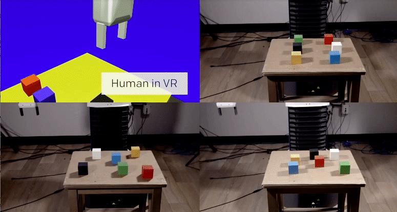 他们的团队在其中一项研究中显示出一次性的学习是有可能的:一个人在VR中演示如何执行特定任务,结果表明,一次演示就足以供算法学会然后在真实条件下再现。