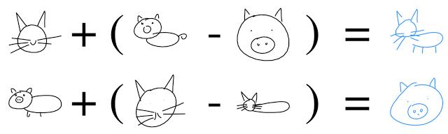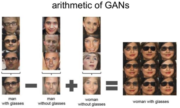 相同的算法也可用于潜在空间:“一个戴眼镜的人”减去“一个人”加上一个“女人”相当于“一个戴眼镜的女人”。