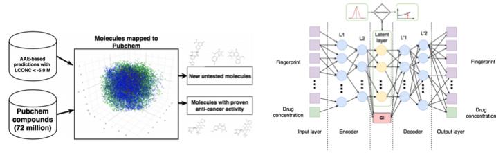 我们已经报道过这一研究的细节。简单来说,在对抗自编码器(AAE)的帮助下,你可以学习分子的潜在表征然后用它来寻找新的分子。通过这种方式已经找到了69种分子,其中一半是用于对抗癌症的,其他的也有着重大潜能。