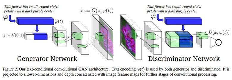 这项研究的作者提出不仅把文字嵌入到生成器(有条件GAN)的输入,同时也嵌入到鉴别器的输入,这样就可以验证文字与图像的相关性。为了确保鉴别器学会运行他的函数,除了训练以外,他们还给真实图像添加了不正确的文字。