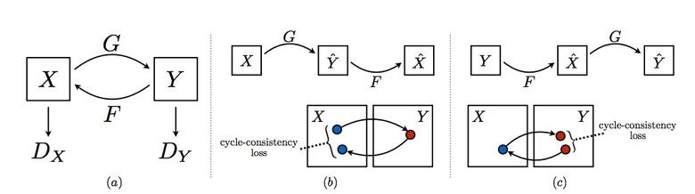 其想法是教两对生成器—鉴别器将图像从一个领域转换为另一个领域,然后再反过来,由于我们需要一种循环的一致性——经过一系列的生成器应用之后,我们应该得到类似原先L1层损失的图像。为了确保生成器不会将一个领域的图像转换成另一个跟原先图像毫无关系的领域的图像,需要有一个循环损失。
