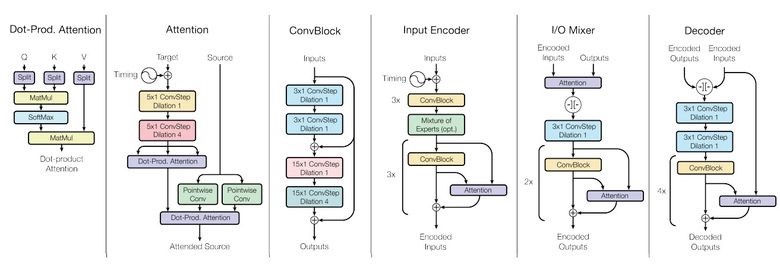 为了实现这一点,他们开发了一个复杂的网络架构,里面有不同的块处理不同的输入数据然后产生出结果。用于编码/解码的这些块分成了3种类型:卷积、注意力以及门控专家混合(MoE)。