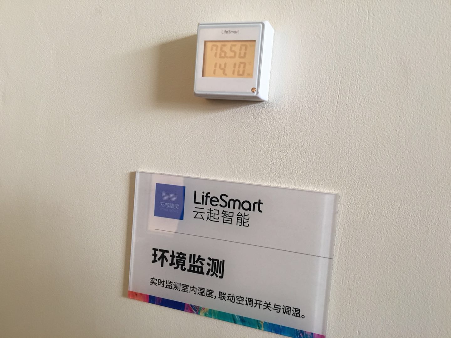 墙壁安有环境监测传感,监测室内温度,联动空调开关进行调温(现场看到的非中央空调,是挂机)。