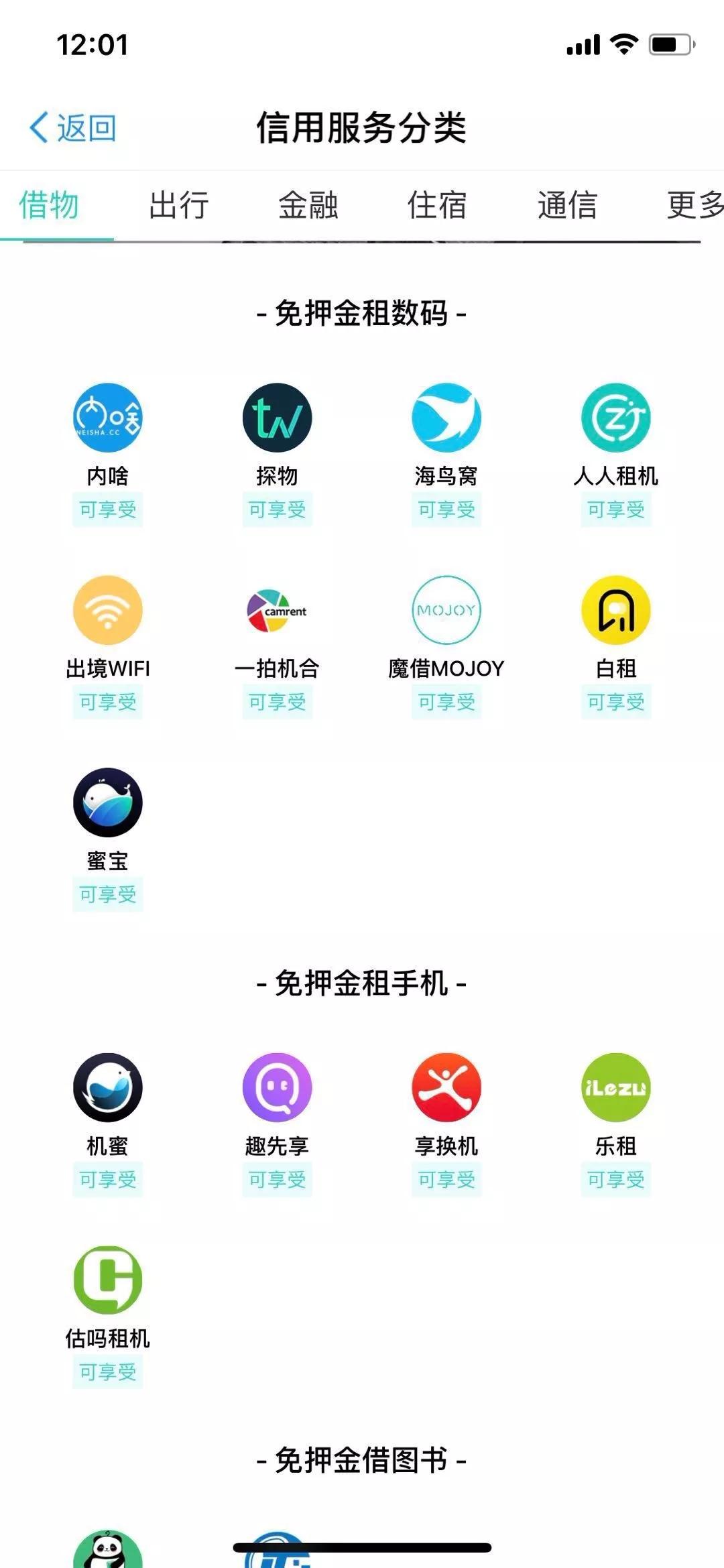 打开芝麻信用,在“信用生活”页面,可以看到多个租赁的场景:租玩具、租奢侈品、租家电……