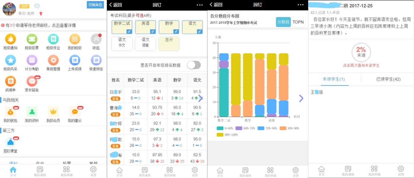 王旭所在的IT团队曾有5年为银行做交易流程监控系统的经验。2年前,这支团队转向教育领域,基于微信服务号,开发了园钉,包含一键录入成绩、发送学情分析、个性化布置作业和考题、定向发布通知等功能,帮助一线中小学教师减轻日常教学、沟通和管理中的负担。