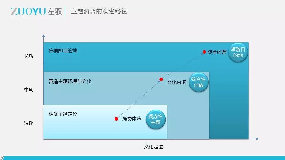 主题酒店的演进路径(如下图),将经历从概念性主题,引入一个概念,吸引对这个概念感兴趣的细分人群,一般比较窄。到综合性住宿,吸引泛主题、泛兴趣客人,最后进化成住宿+目的地的形式,带给客人全方位的文化体验。
