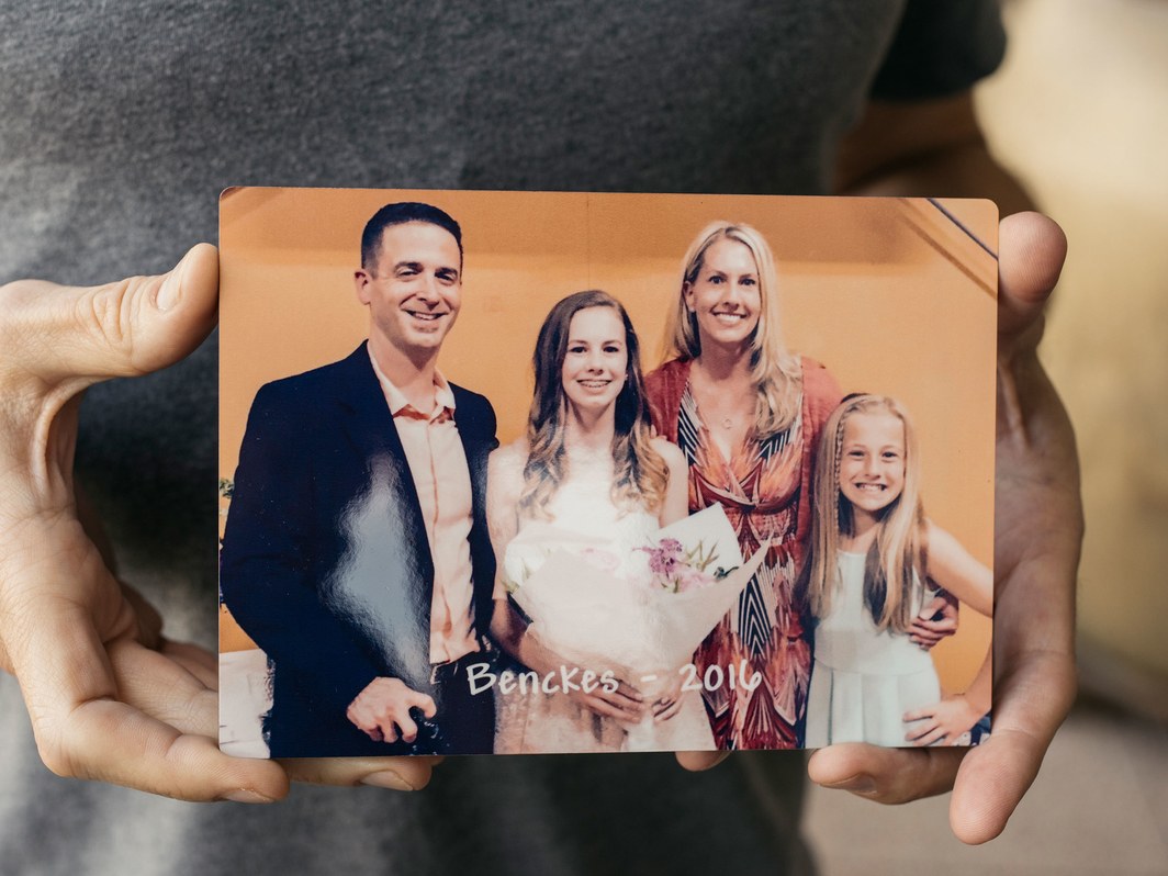 Matt Bencke拿着家人的照片。摄:Kyle Johnson