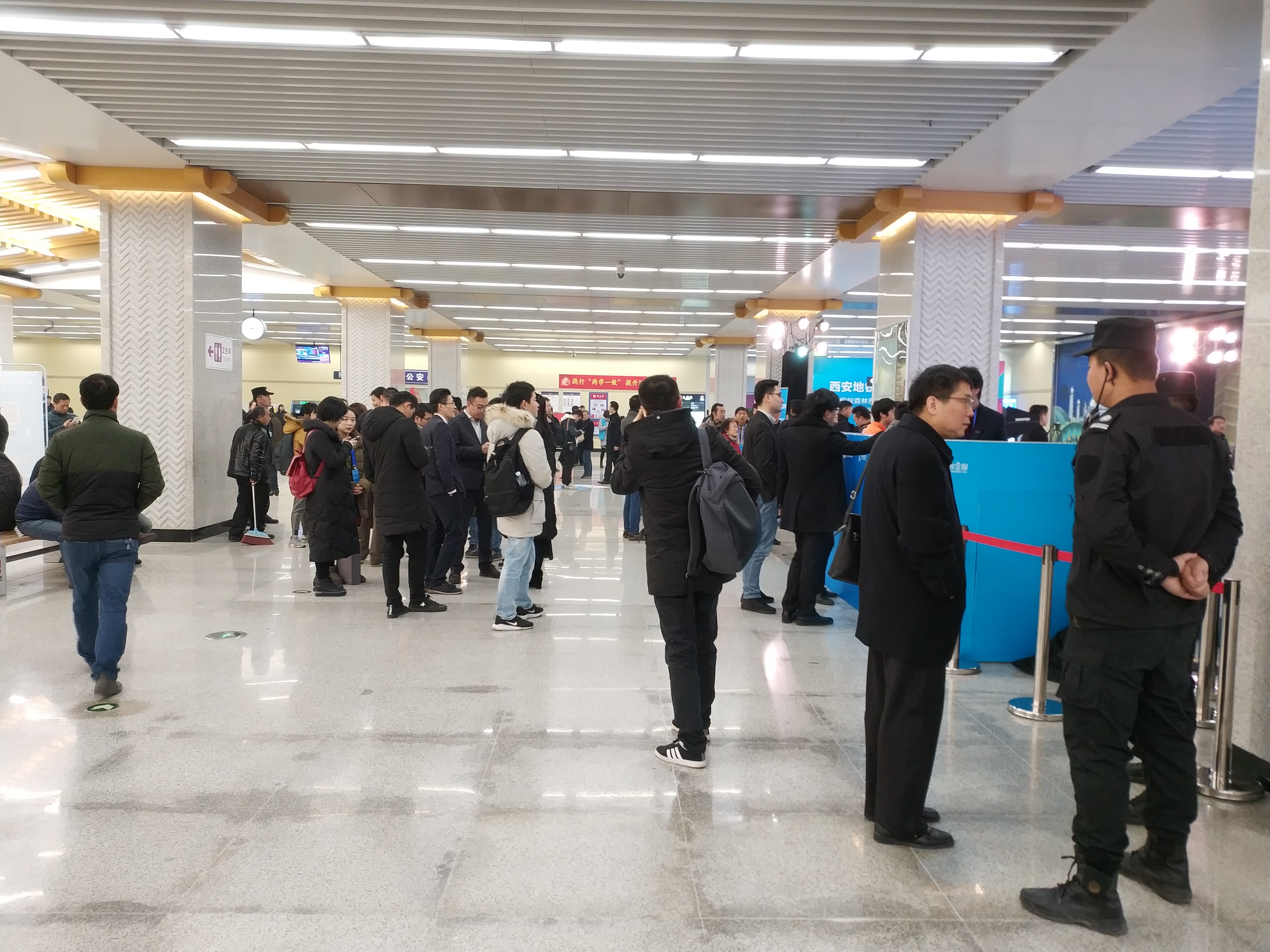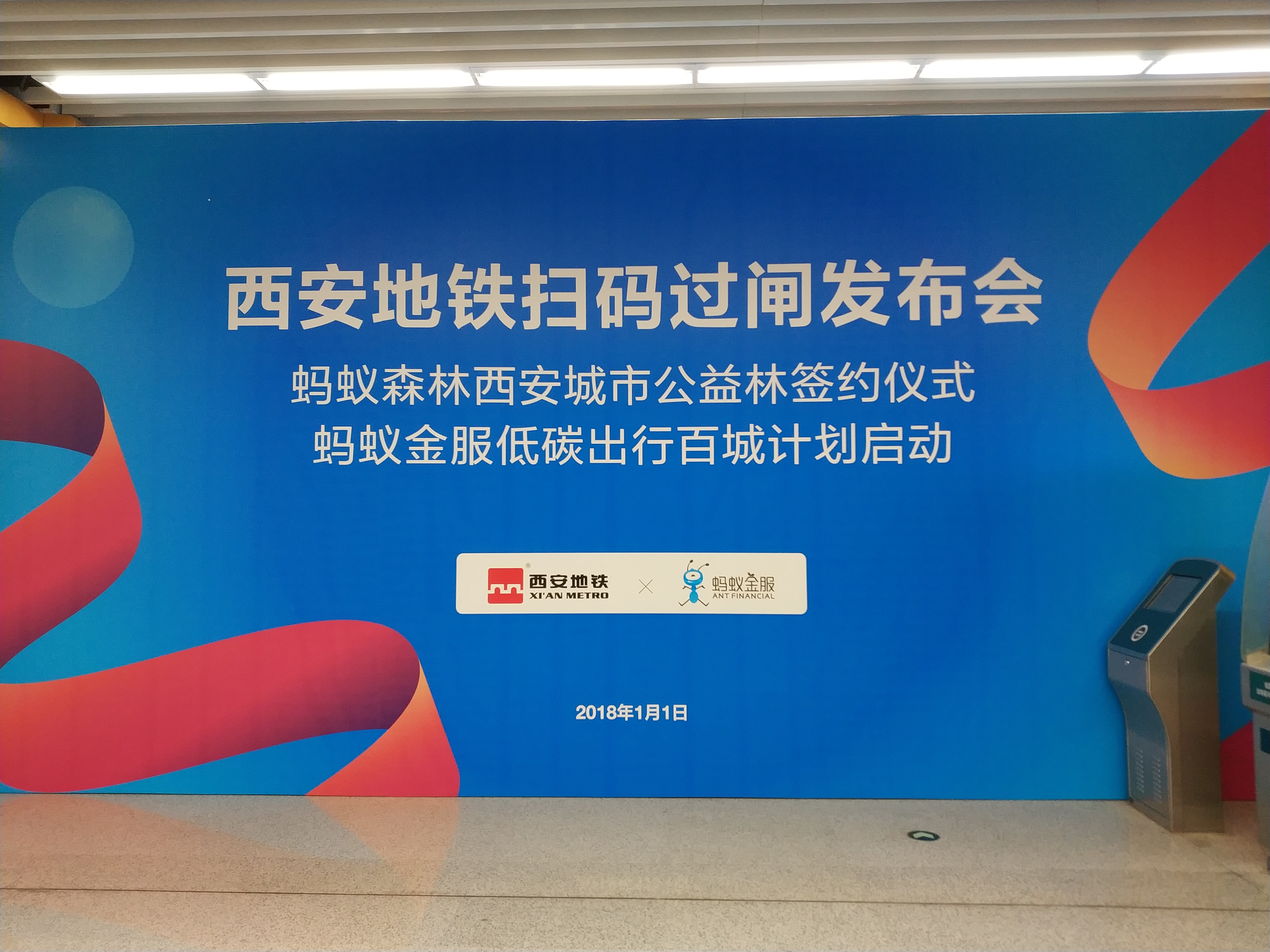 今天上午,我们来到了西安大雁塔地铁站,这是合作双方的背景板和现场等待体验的人群。首先开通乘车码需要打开支付宝。