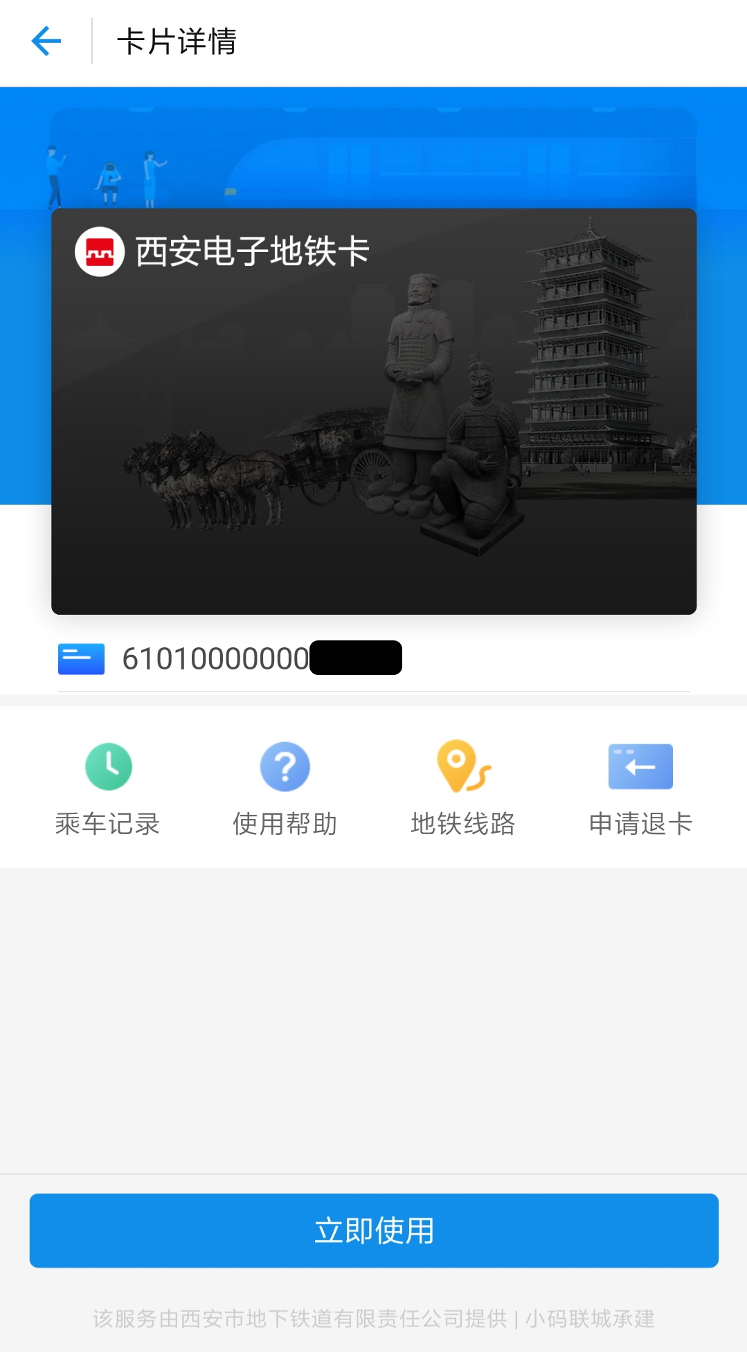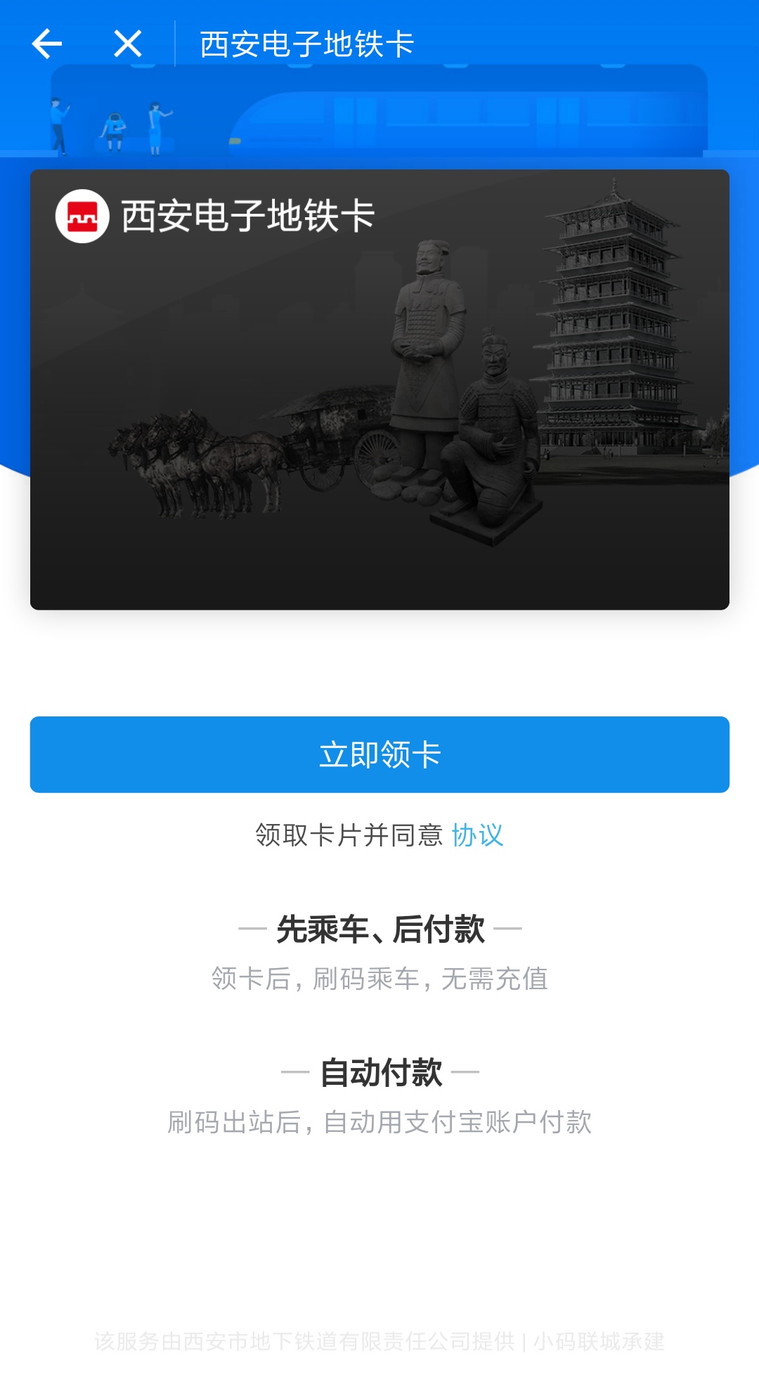 点击「西安电子地铁卡」,出现如下页面,同意领取协议后点击「立即领卡」。