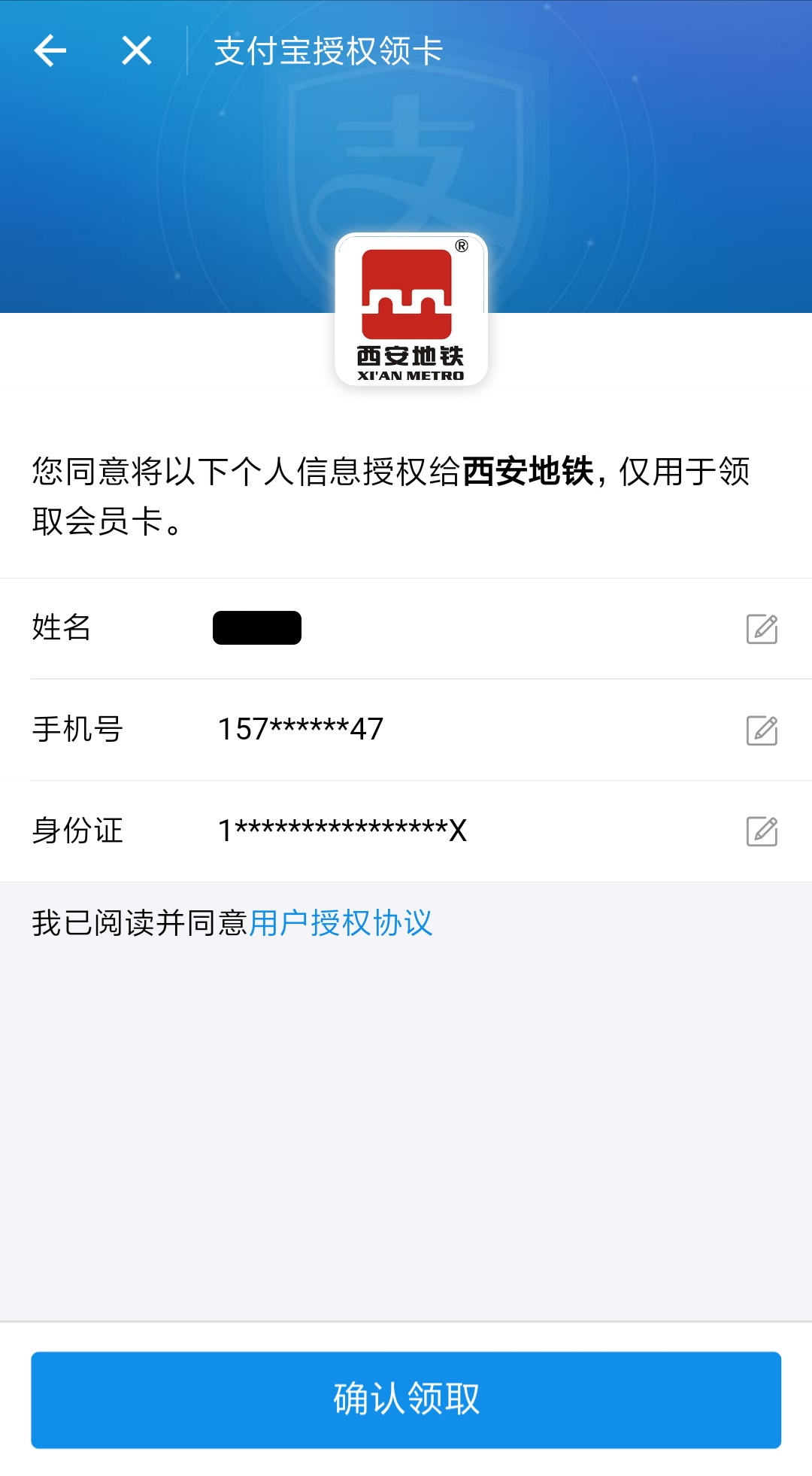 领取成功后会出现授权界面,将身份证信息与西安地铁APP绑定,与办理传统的地铁卡无异。