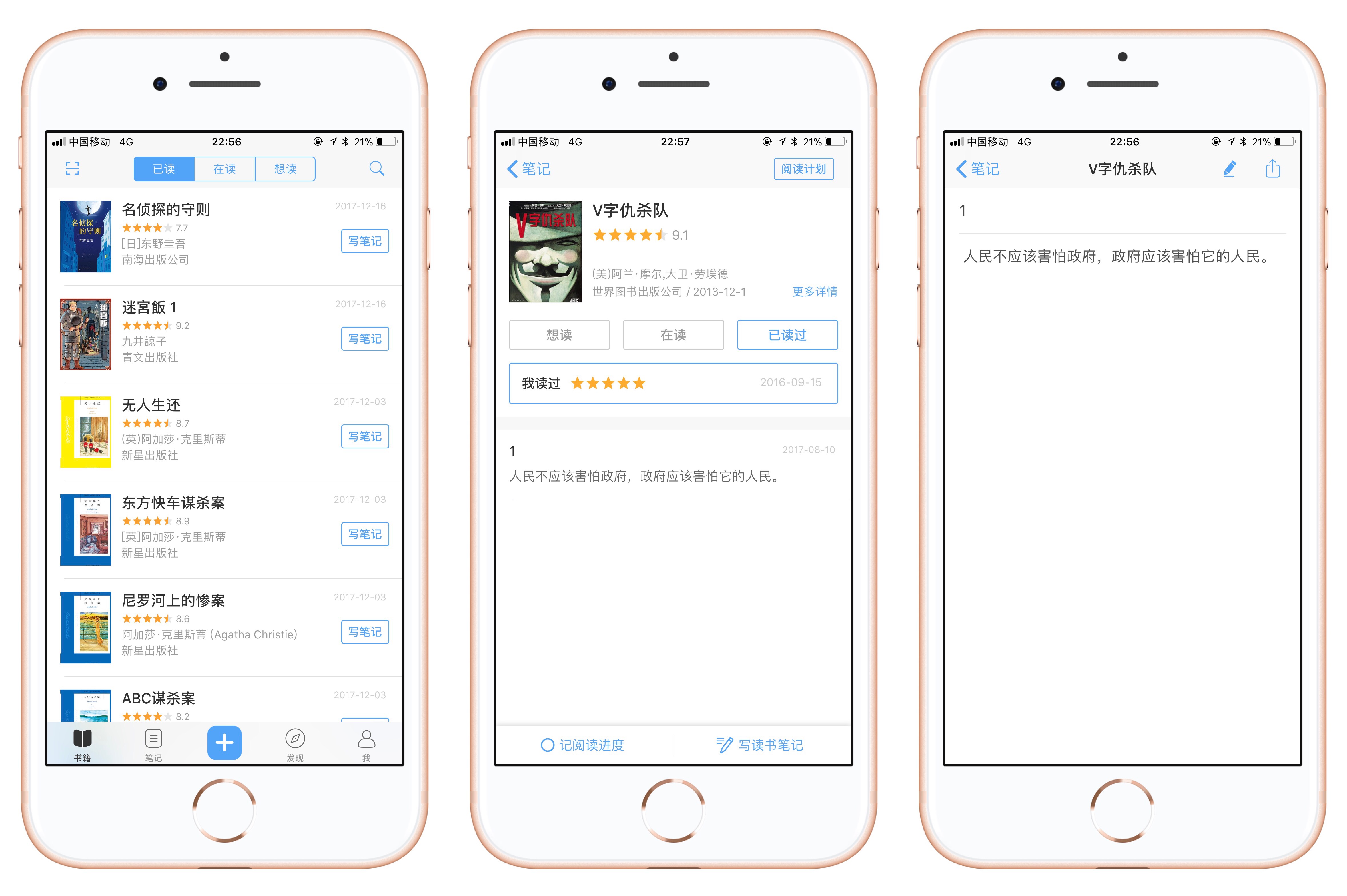 为了让你更舒服地做笔记,瓣读可谓费尽苦心。底栏、列表、3D Touch、书籍详情页;几乎所有可能触及的地方,都能随时开始记录。为了方便摘抄,瓣读还集成了 OCR 文字识别功能,只需对着书本拍张照,就能自动提取里面的佳句。你还可以导入 Kindle 笔记,或将读书笔记自动同步至印象笔记,永久保存。