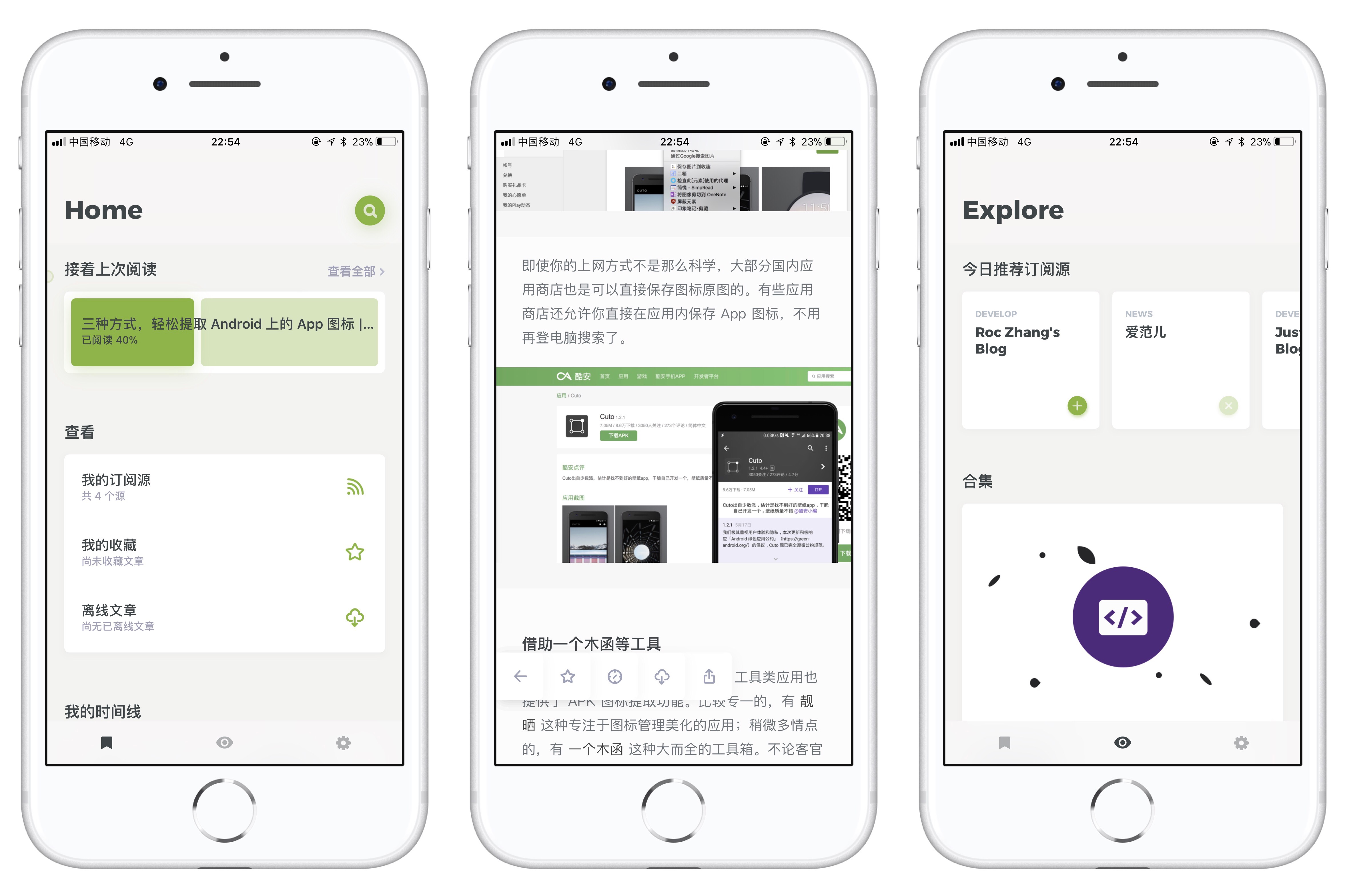 打开首页,Adonis 就会提示你是否继续阅读之前没看完的文章,你也可以按订阅源或更新时间浏览。值得一提的是,除了传统的分享方式外,你还可以将选中的文本生成一张精美的图片,更优雅地发布在其它社交网络。