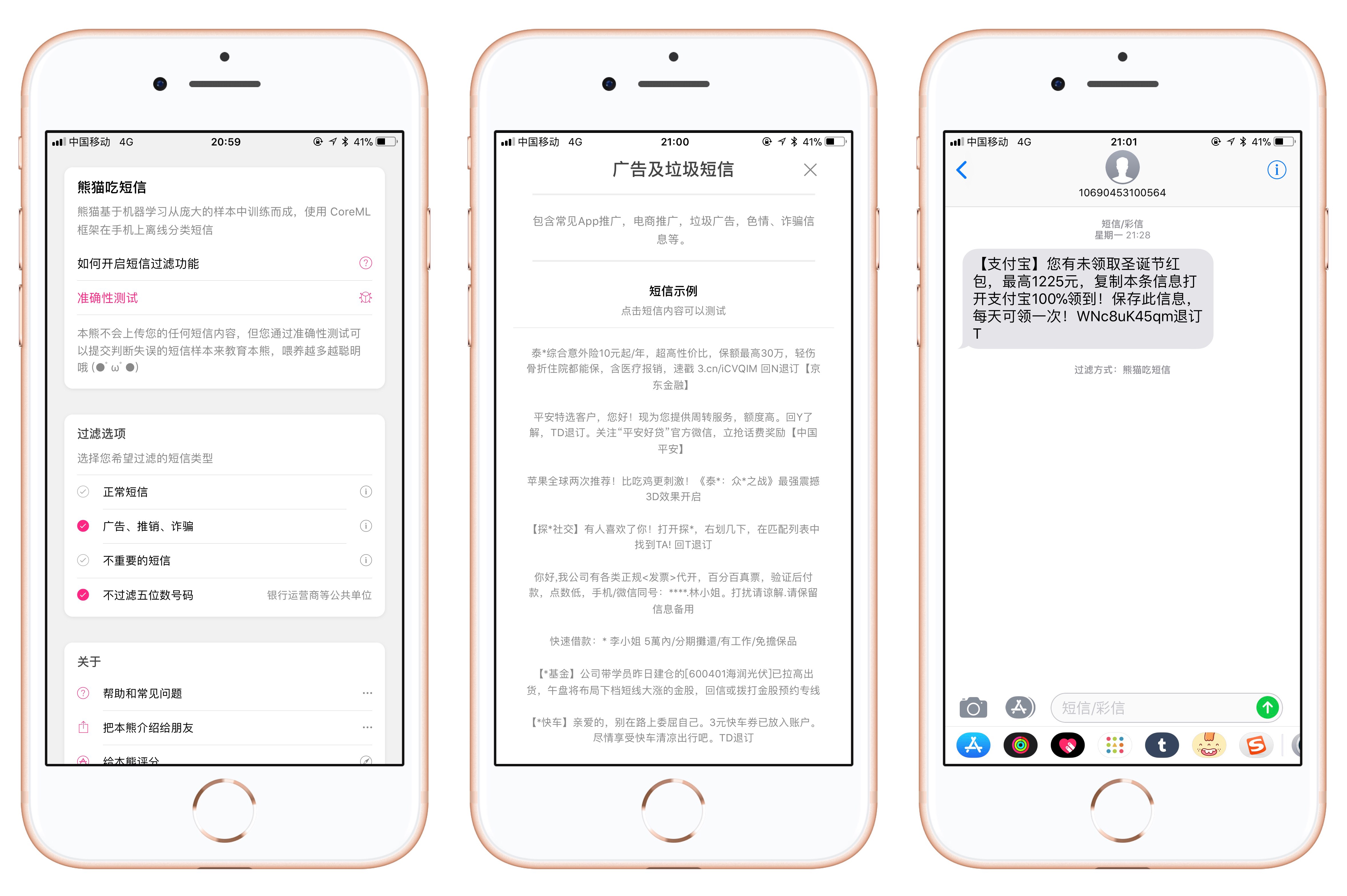 据我本人体验,熊猫吃短信的实际表现也相当不俗,将最近猖獗的支付宝红包欺诈短信悉数拦截,而如果你使用的是其它应用,则很可能因为触发「支付宝」白名单关键词而将其错误分类为正常短信。