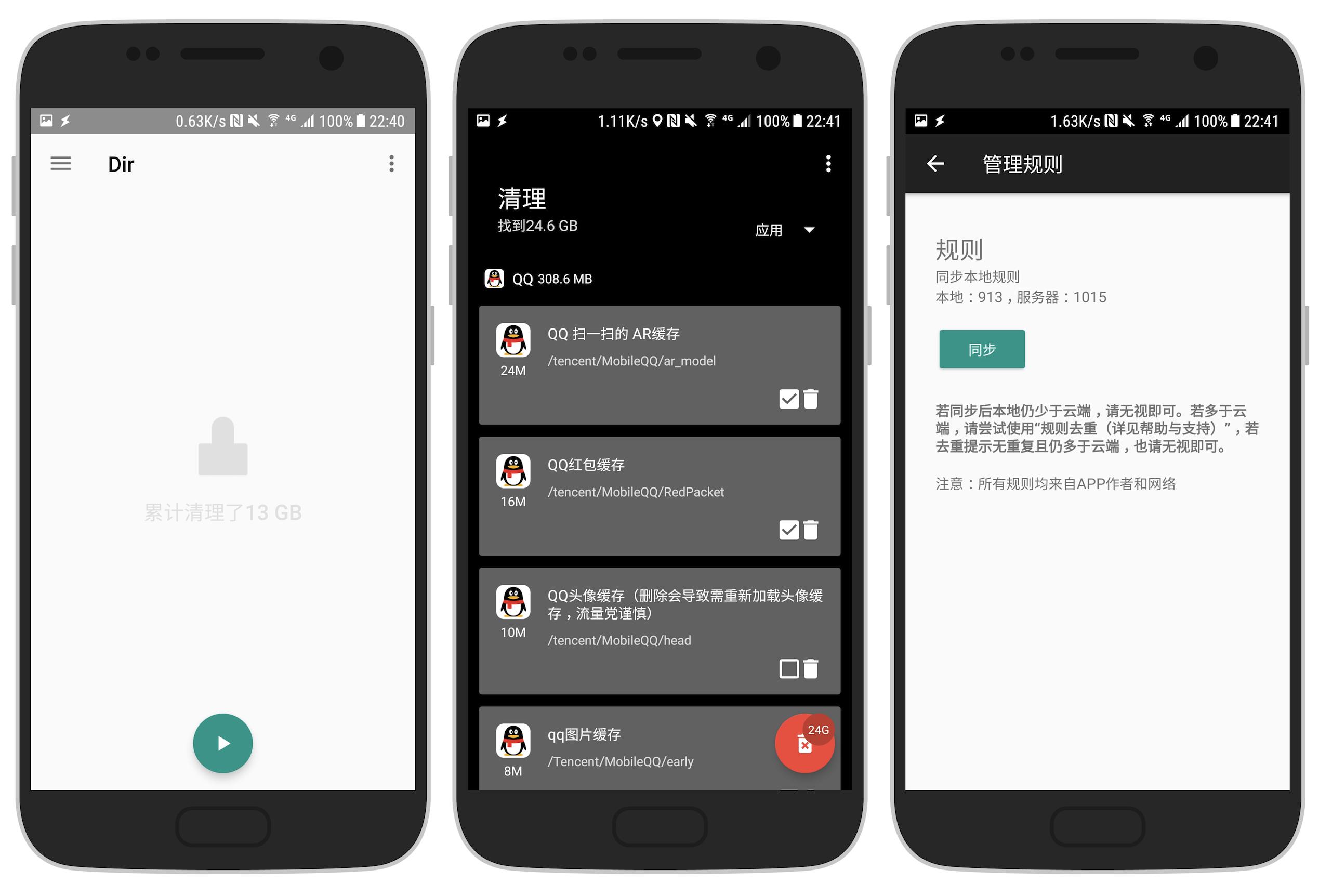 与其它同类应用相比,Dir 的功能和权限极为克制,完全遵守 Android 绿色应用公约 规范,让你无后顾之忧。此外,Dir 还拥有由热心社区成员共同维护的清理规则数据库,如果你正在使用一款小众 App,也可以自己提交规则完善 Dir 的清理功能。