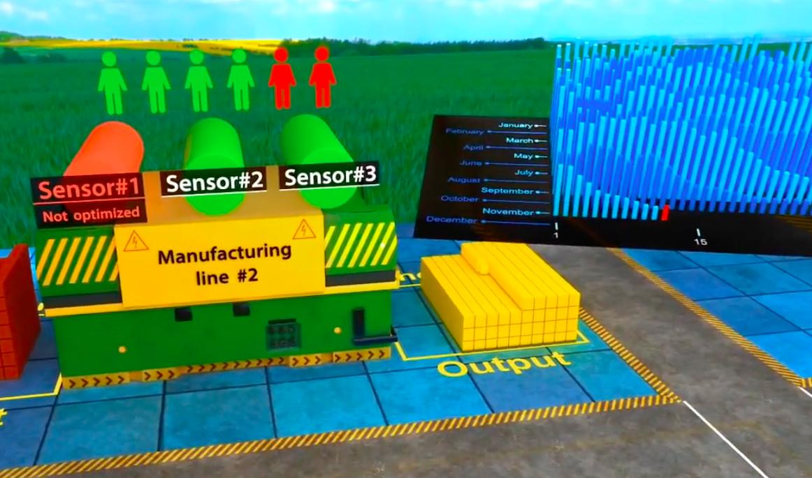 比如你需要知道几千公里外一处分公司本周产生的数据、每条生产线的出货量、次品率等,带上VR眼睛,用眼睛和手配合点击、滑动就能看到立体、全面的统计图、数据模型等。此外,点击任何数据对象,就可以查看它的数据。例如,在风力发电站中,单击风力发电机组,会出现内部的单个传感器,并呈现其过去一段时间的性能数据。