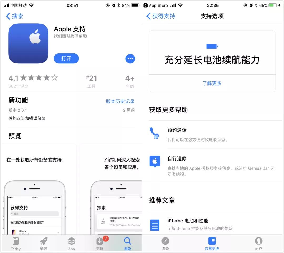 预约需要到 App Store 上搜索并下载「Apple 支持」App,在「获得支持」页面中搜索「电池问题或故障诊断」,选择「自行送修」即可。