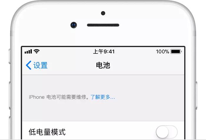 首先,将 iPhone 升级到 iOS 10.2.1 或以上版本的系统,并打开「设置」>「电池」。如果你的 iPhone 电池有问题,就会出现「iPhone 电池可能需要维修」的提示,此时需要预约才能进行维修。