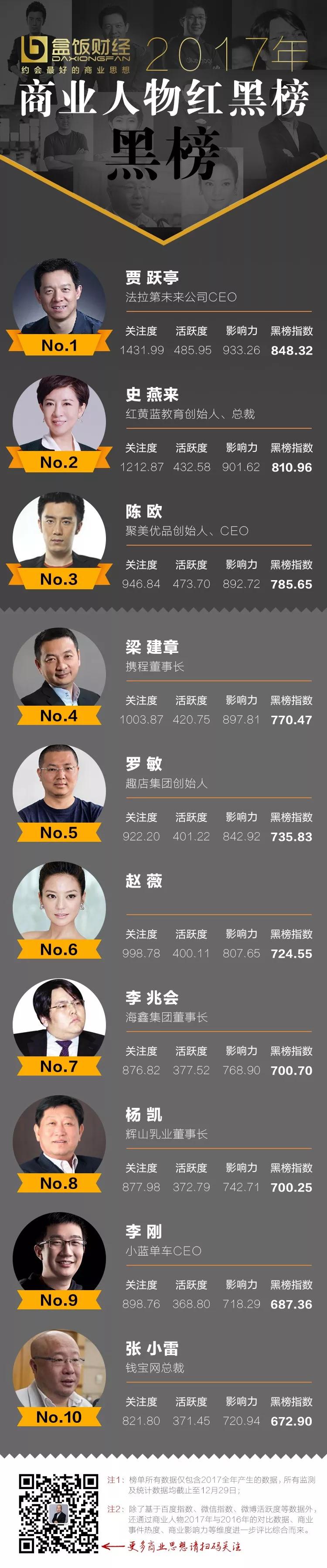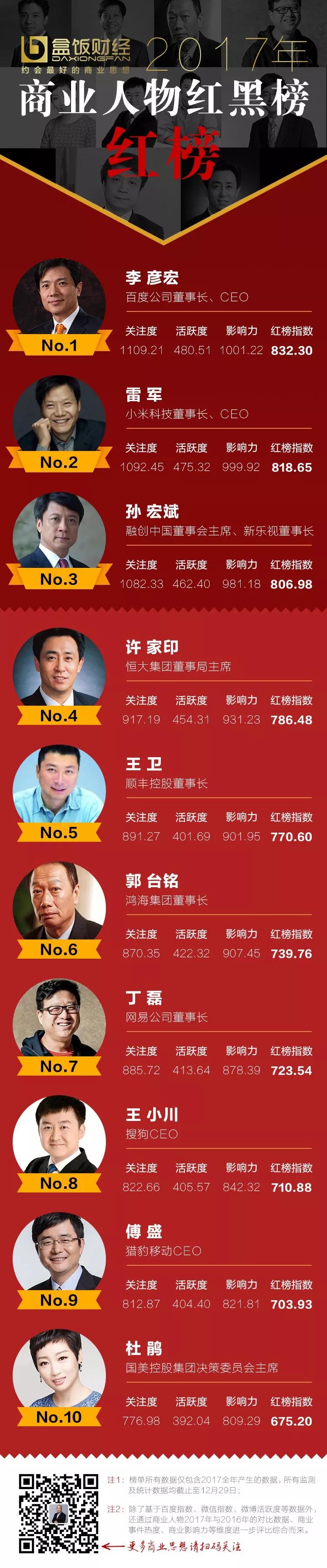 盒饭财经基于各项社交、媒体、搜索等平台指数,并通过2017年与2016年对比数据、商业事件热度、商业影响力等维度综合评比,推出了今天你所看到的《2017年十大商业人物红黑榜》,榜单中的人或多或少都影响过你或你身边的人。