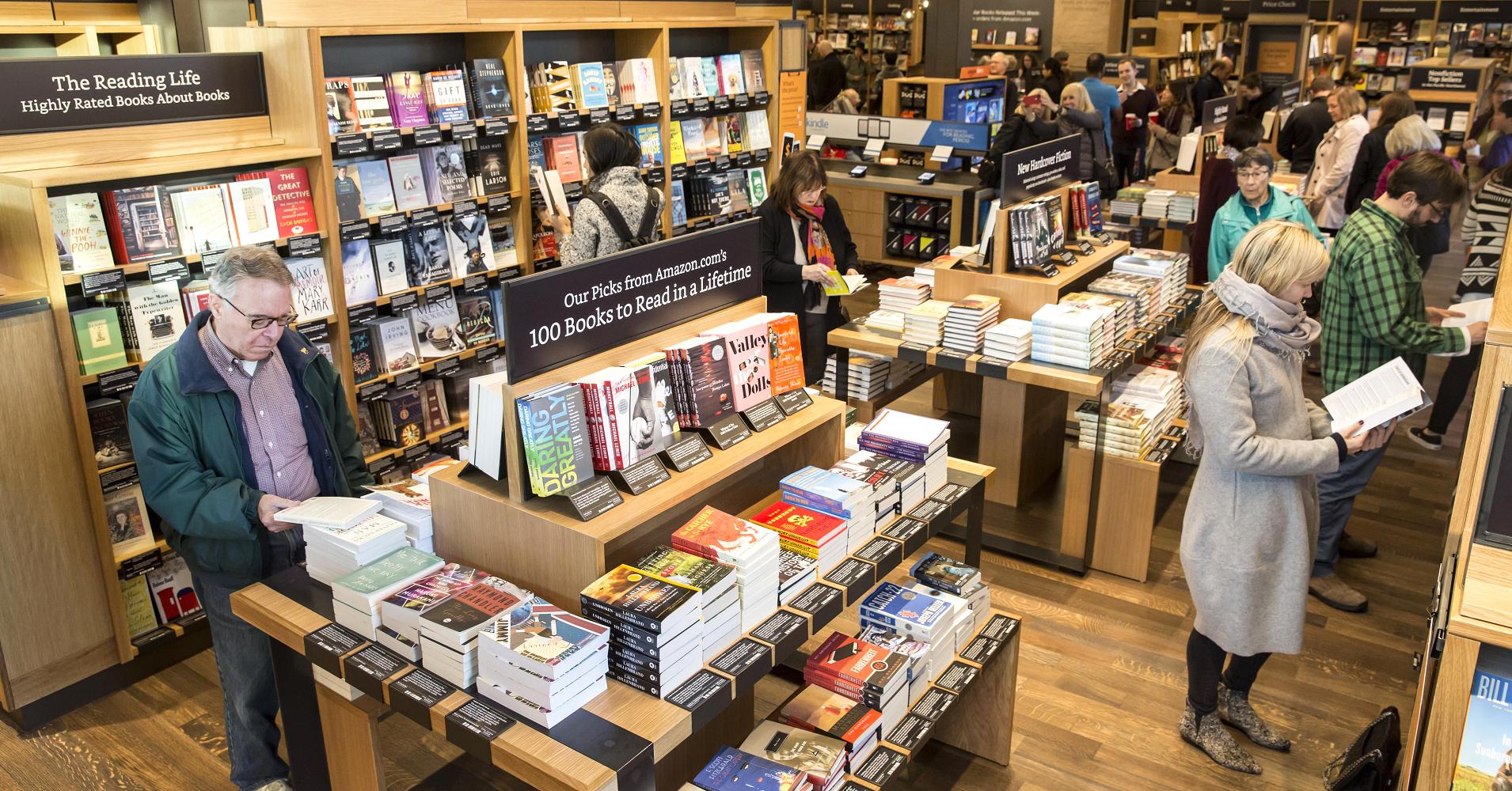 (2015年11月4日,在华盛顿州西雅图的新开张的亚马逊书店里,顾客们正在浏览书籍。这家在线零售商于2015年11月3日开设了第一家实体书店)