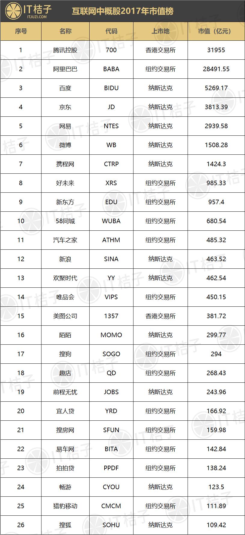 今天,IT 桔子(ID:itjuzi521)统计了截止 2017 年最后一个交易日(当地时间 2017 年 12 月 29 日)收盘时,互联网科技领域的中概股(上市地点仅包括美国与香港)市值情况,并统一将市值统换算成等值人民币,再根据市值高低进行排序,筛选出市值超过 100 亿元的 26 家公司。