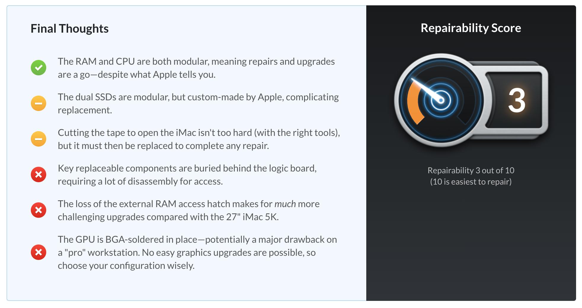 最后,iFIxit 仅仅给 iMac Pro 打出了 3 分的「可维修度」评分(总分 10 分,分数越高说明越好维修)。