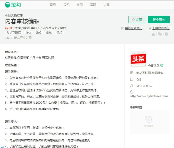 遭遇整顿后,今日头条开始大规模招聘内容审核编辑岗位,加强内容审核。在天津,今日头条招募内容审核编辑,负责监控审核今日头条平台内容是否违规,薪资约为4000至6000元/月。该职位要求关心时事,具有良好的政治敏感度和鉴别力,要求本科及以上学历,党员优先。此外今日头条还在北京招聘国际化内容审核编辑,负责审核日语视频,是否存在暴力、色情、恐怖等不和谐内容,要求本科及以上学历,薪资约为6000至12000元/月。据悉,今日头条此次招聘内容审核编辑,负责海内外产品的内容审核人员,总的新增规模在2000人左右。