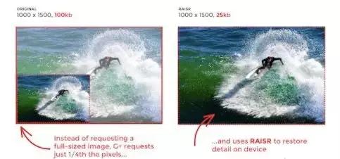 2016年,谷歌相关团队推出了一款叫做RAISR(Rapid and Accurate Image Super-ResoluTIon)的图像压缩技术。这个解决方案就是以人工智能技术作为压缩路径,效果能达到将图片压缩到源文件的1/4, 却基本不改变图片的清晰度。