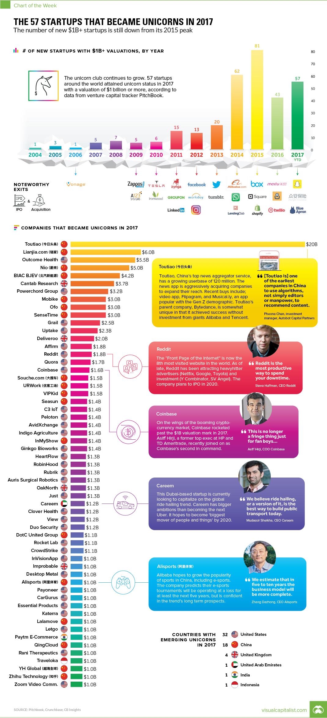 一方面,2017年,有57家公司新加入了独角兽行列,数目仅次于2015年。估值最高的是200亿美元的今日头条,Coinbase也成为了首个比特币相关的“独角兽”。