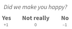 我们可以使用一个商业上的数字,如订阅数量或用户流失量。 我们可以也使用销售额,净收入或利润。这些数字不直接体现产品或服务的设计。 他们也不能告诉我们,客户是满不满意,使用过程愉不愉快而这就是NPS设计的目的,尽管它并不成功。 那我们能做些什么呢? 我提出以下替代问题: