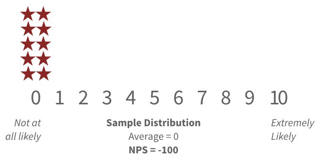 假如有一天,我们运气不好,10位受访者全给出了0分,这十个数字的平均值也是0。NPS是-100。 也就是最糟糕的评分。这很有道理了。 0分是糟糕的分数。 那团队自然没有奖励,很正常。