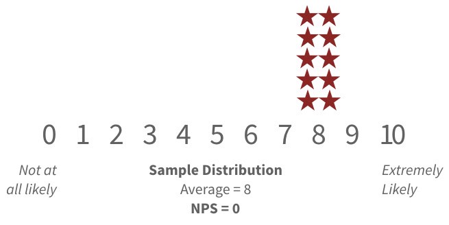 当然,这是因为每个受访者都给了6分。加入产品做得足够好,每个人都给出8分呢? 评分平均值是8。然而,NPS现在是0。