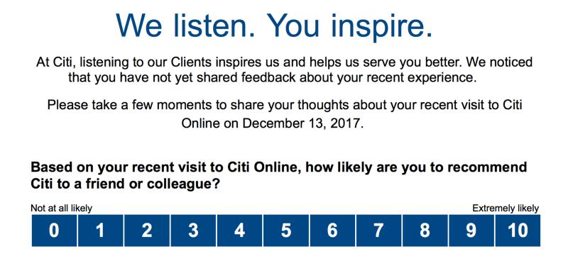 有个朋友知道我在写这篇文章,于是向我介绍了他们在使用花旗网上银行网站后,收到的NPS问题。