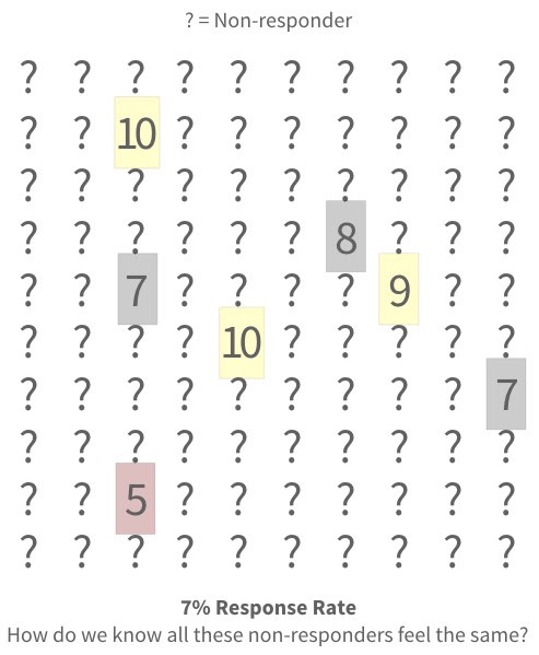 另一个诀窍是忽略回复率。大多数NPS跟进或任务后调查的回复率只有4%-7%。答复率为7%意味着,每有1人回复,就有13人没回复。这13人的评价会和已回复者评价相同吗?可能不会。