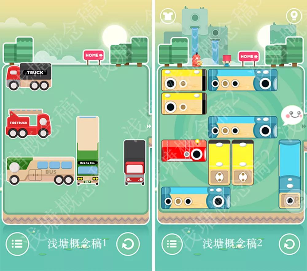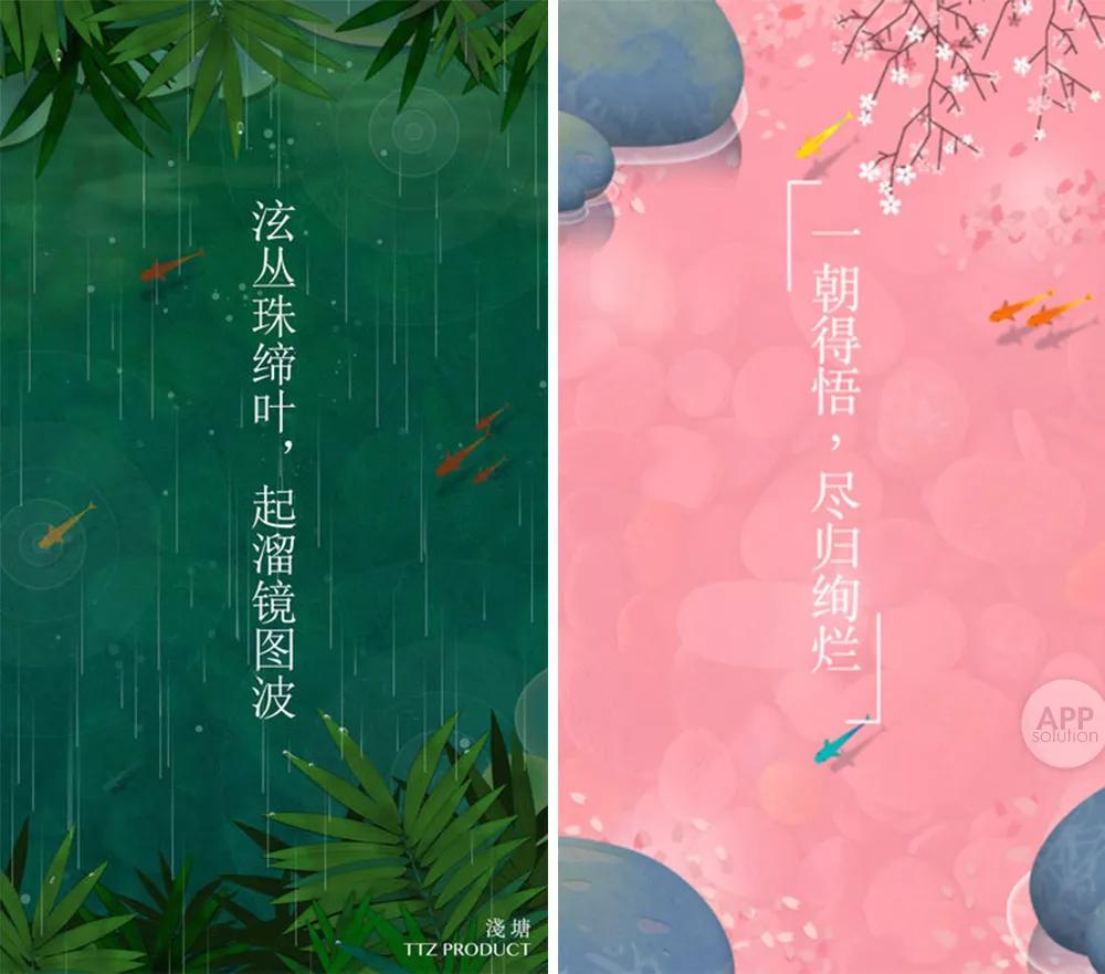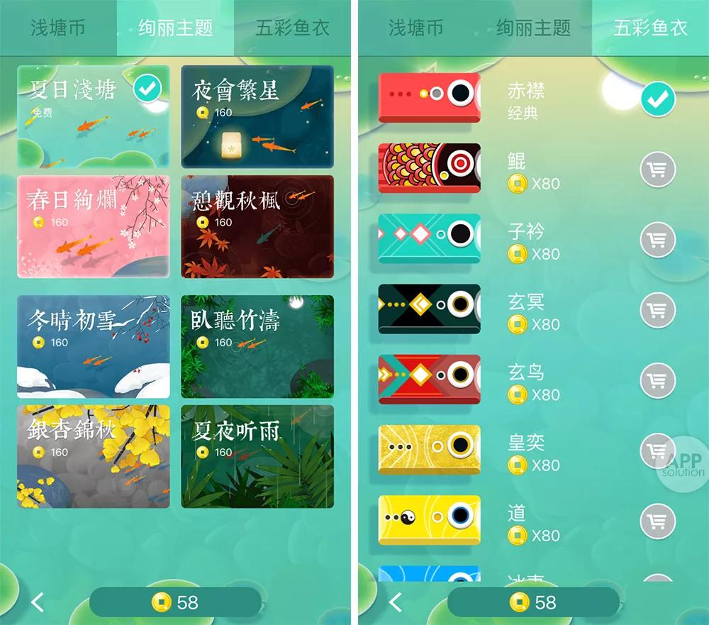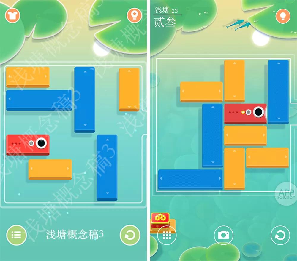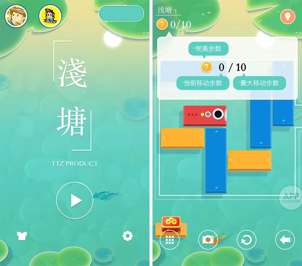 《华容道》式的益智滑块游戏与静谧的池塘,动静结合;鲜亮的色调、舒缓的音乐,和青青荷叶、一双红鲤等古典元素融合在一起,相得益彰。